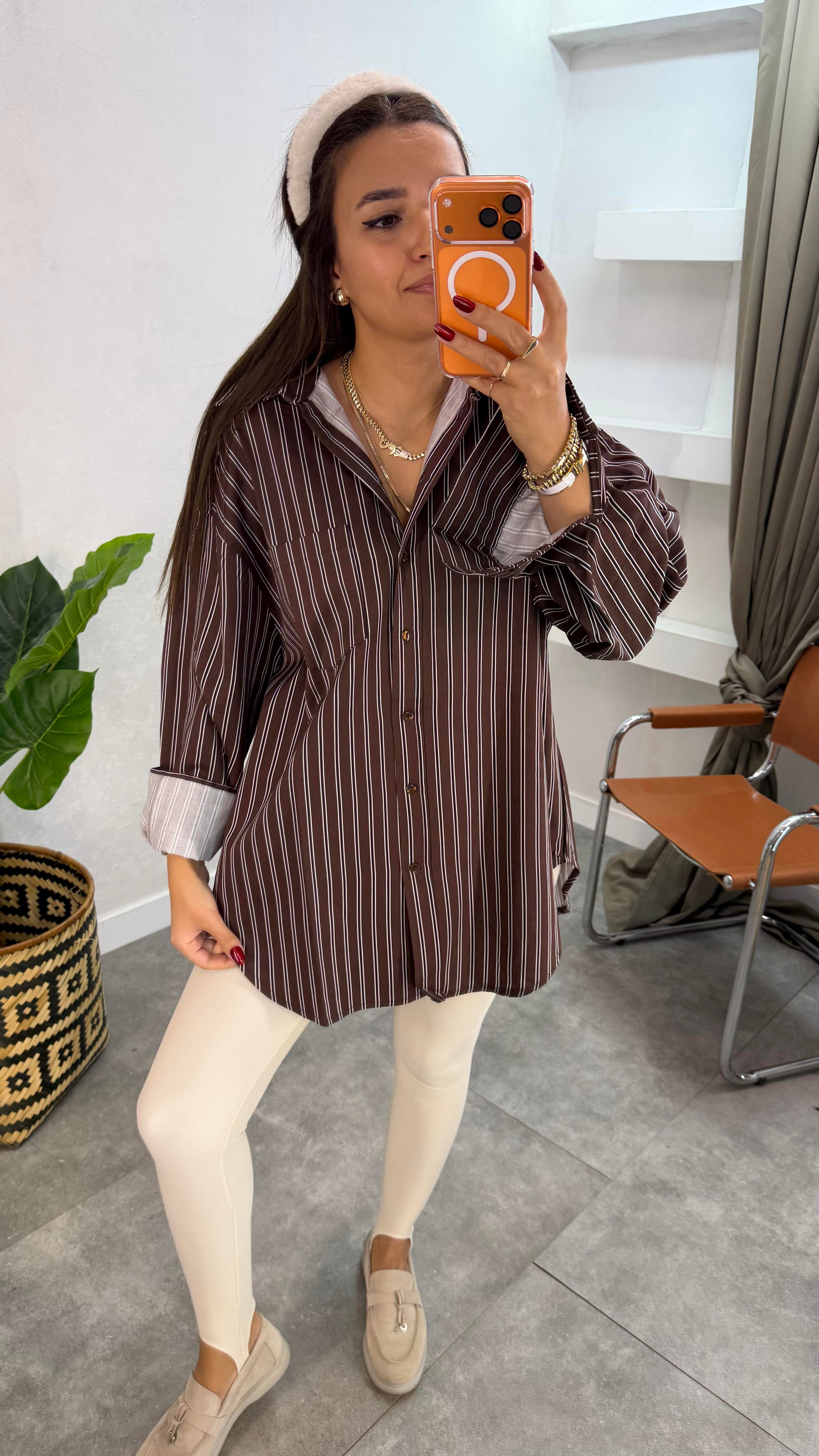 KAHVE OVERSİZE ÇİZGİLİ GÖMLEK